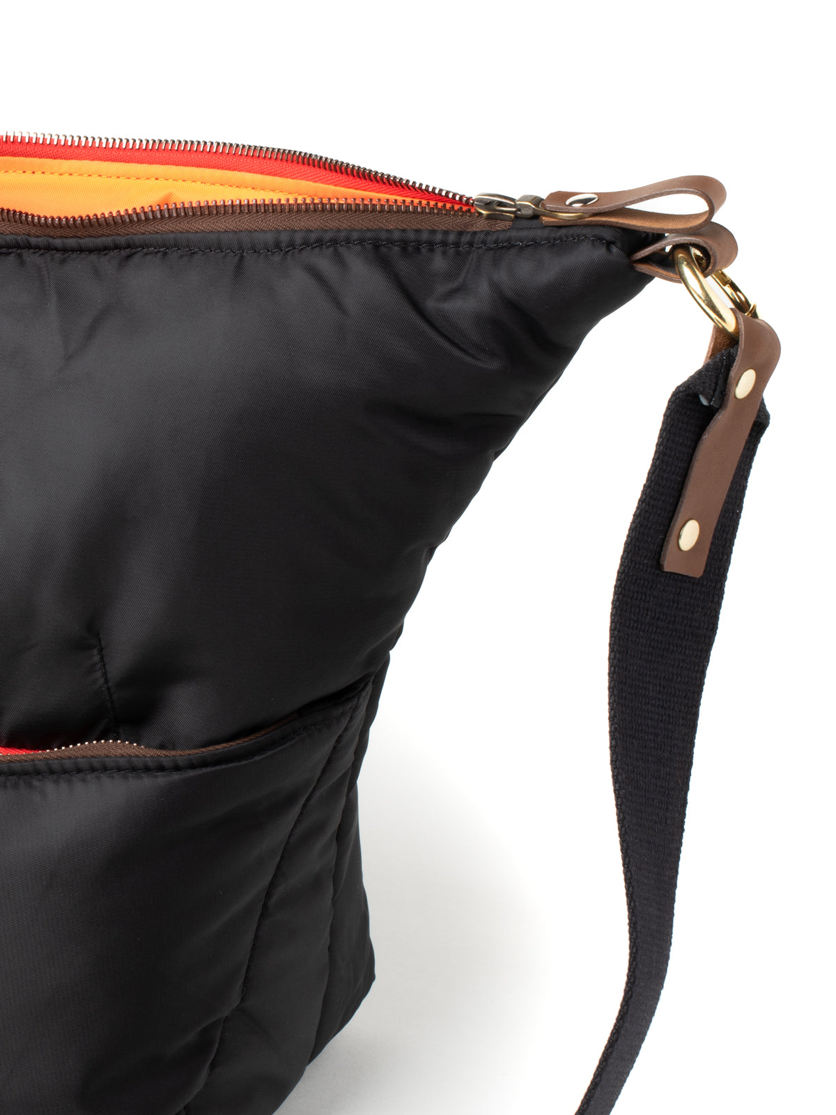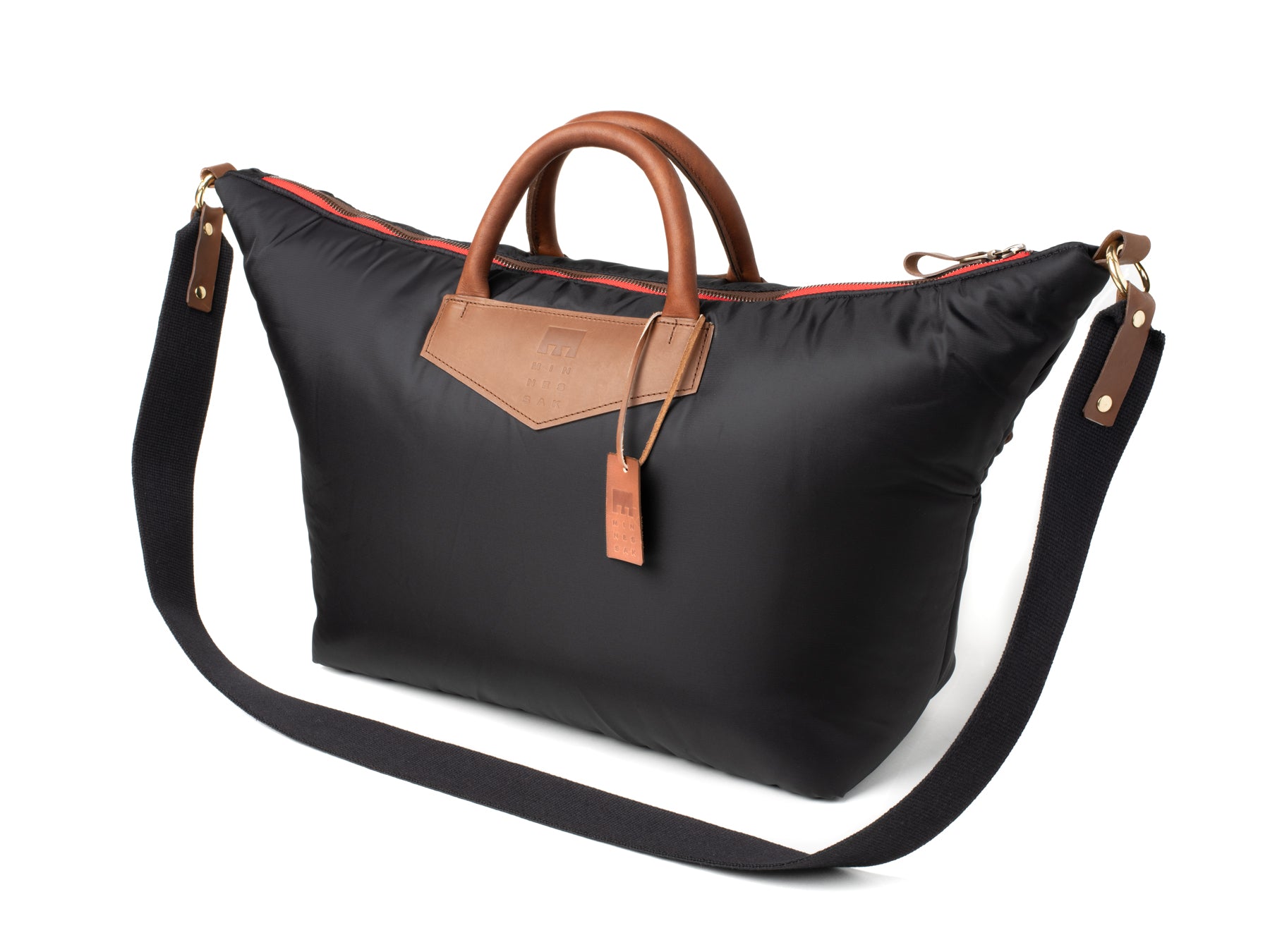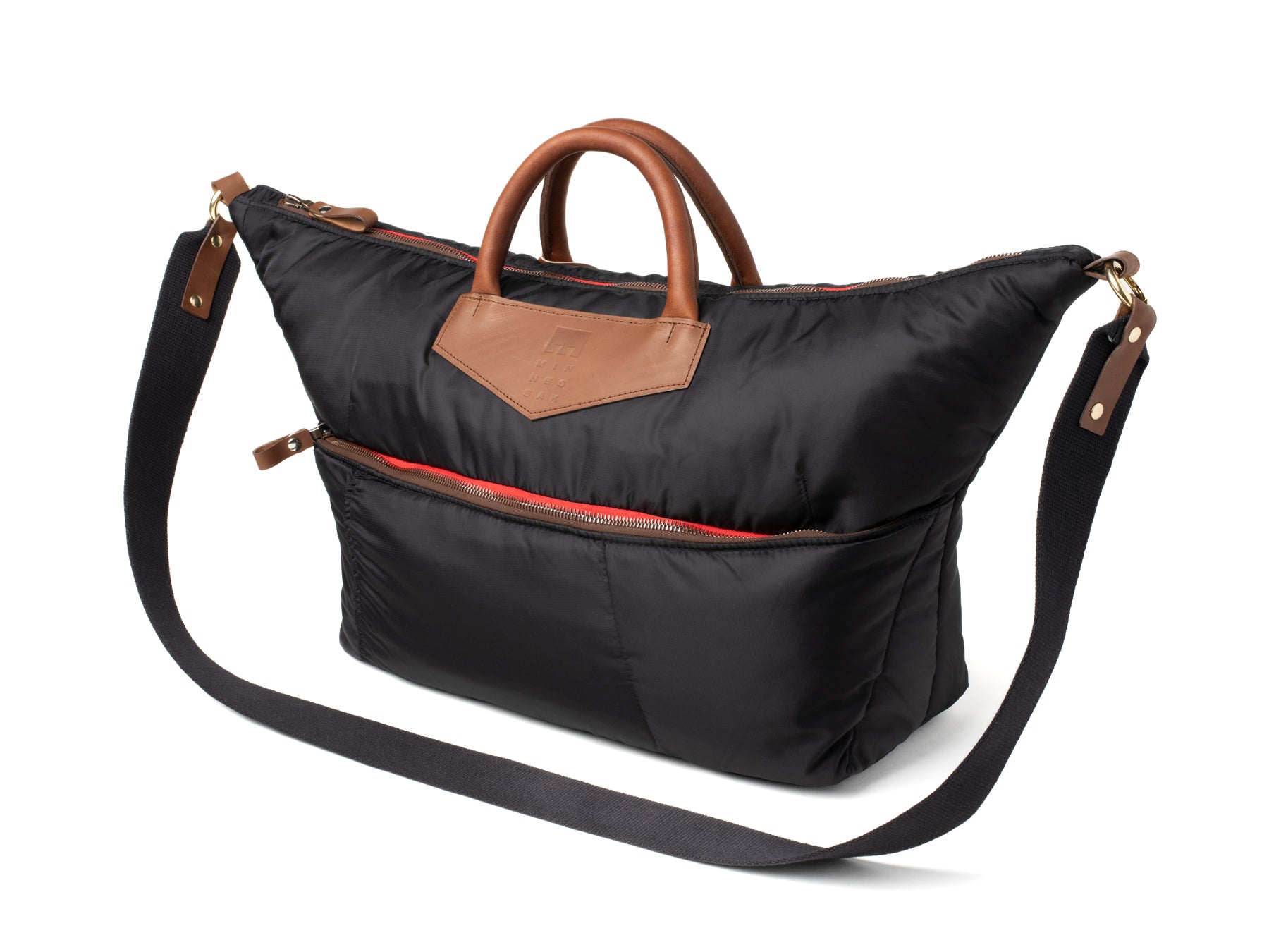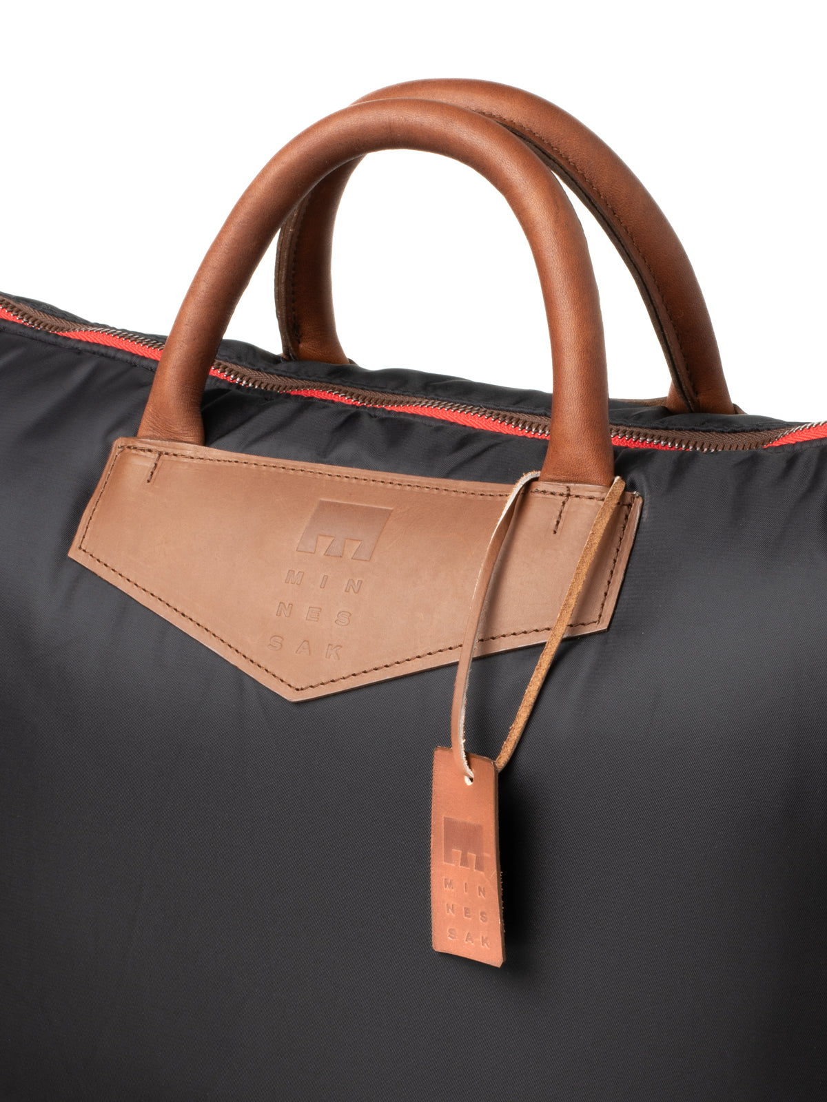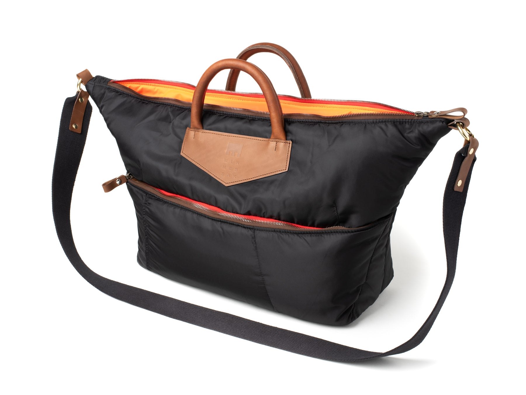 • Minnessak branded leather pouch stitched in to recycled polyester orange interior lining