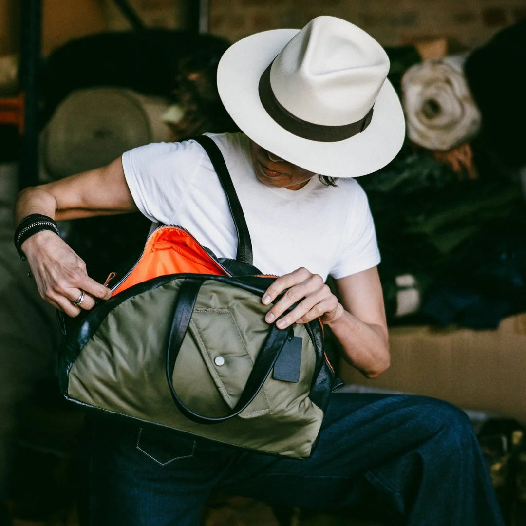 The main material? Repurposed MA1 jackets. Highly popular among the music scene in the ‘90’s, our Head of Design, Jas has a personal history with these jackets having designed, made and supplied many a famous band, label and club with them, from Acid Jazz to Ministry of Sound.